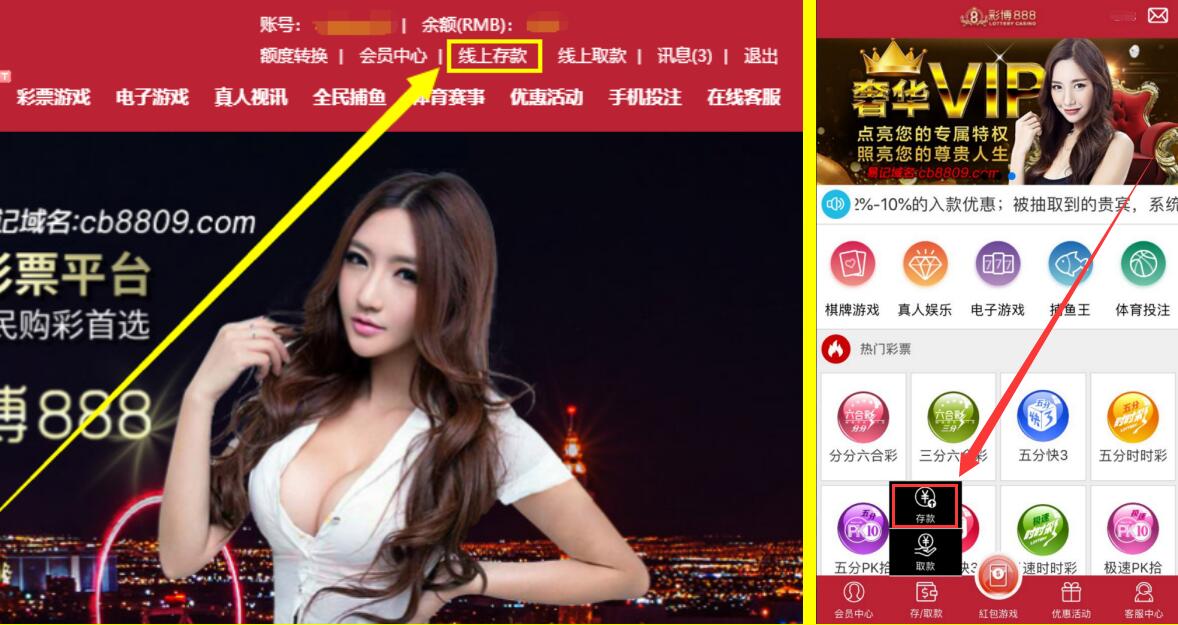 手机用户:登入您的会员账号, 点击【存/取款--存款】