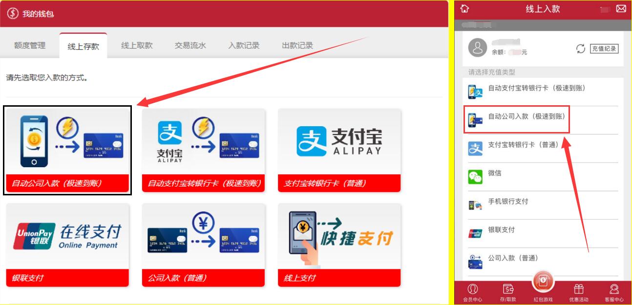 电脑/手机用户:进入线上存款页面,点击自动公司入款(极速到账)。