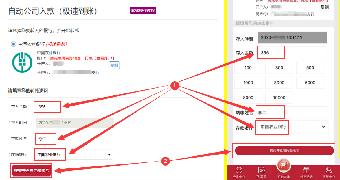 电脑/手机用户:选择要【转入银行】(即您即将要转入的我司收款银行)→填写【存入金额】(请存入有尾数金额,方便系统 辨别.如:235、876 个位数有尾数的金额,最低存款1元)→填写【存款姓名】(即会员扣款银行卡户主姓名)→选择【转账银行】(即您要扣款 的银行名称)→点击【提交并查看完整账号】