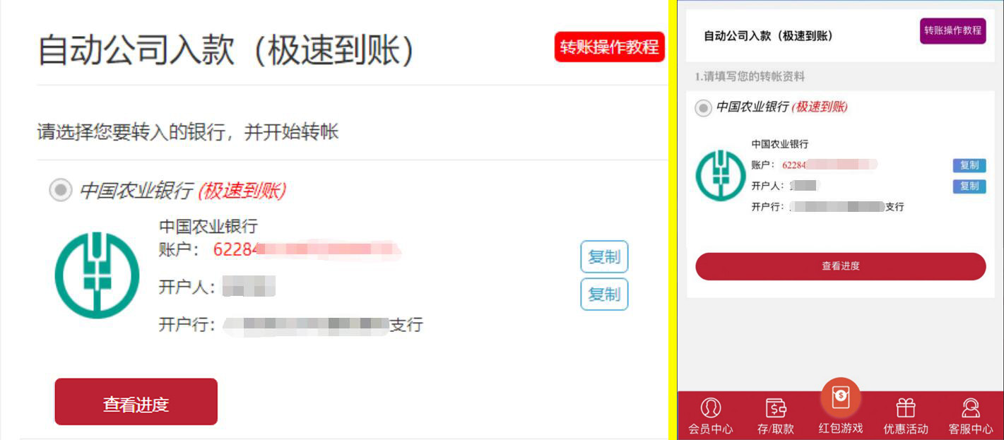 电脑/手机用户:查看并记录好公司的【入款卡号、开户人姓名、开户行等信息】→在一小时内使用【手机银行、网银等转账工具】对我司银行卡转账,转账时【请务必转入填写的存款金额】以便系统尽快核实您的款项并为您添加额度。(成功转账后,可通过查看进度,查看您的额度是否添加。)